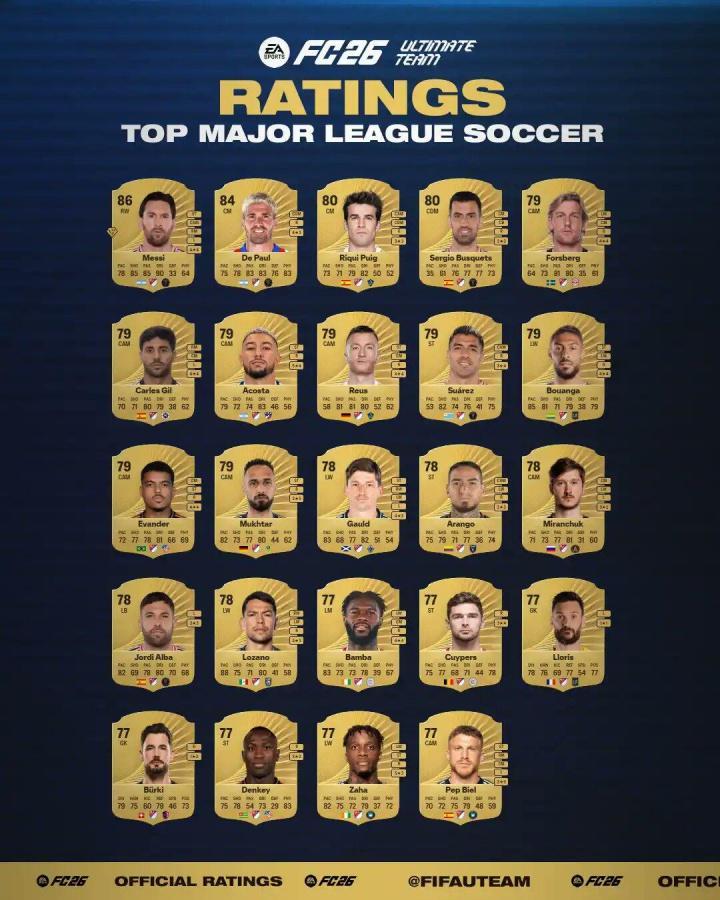 直播吧09月03日讯 FC26官方公布美职联球员能力值排行,梅西以86的能力值位居第1!